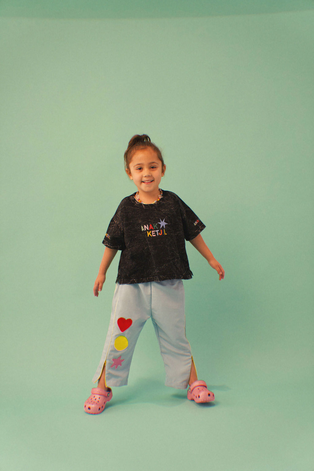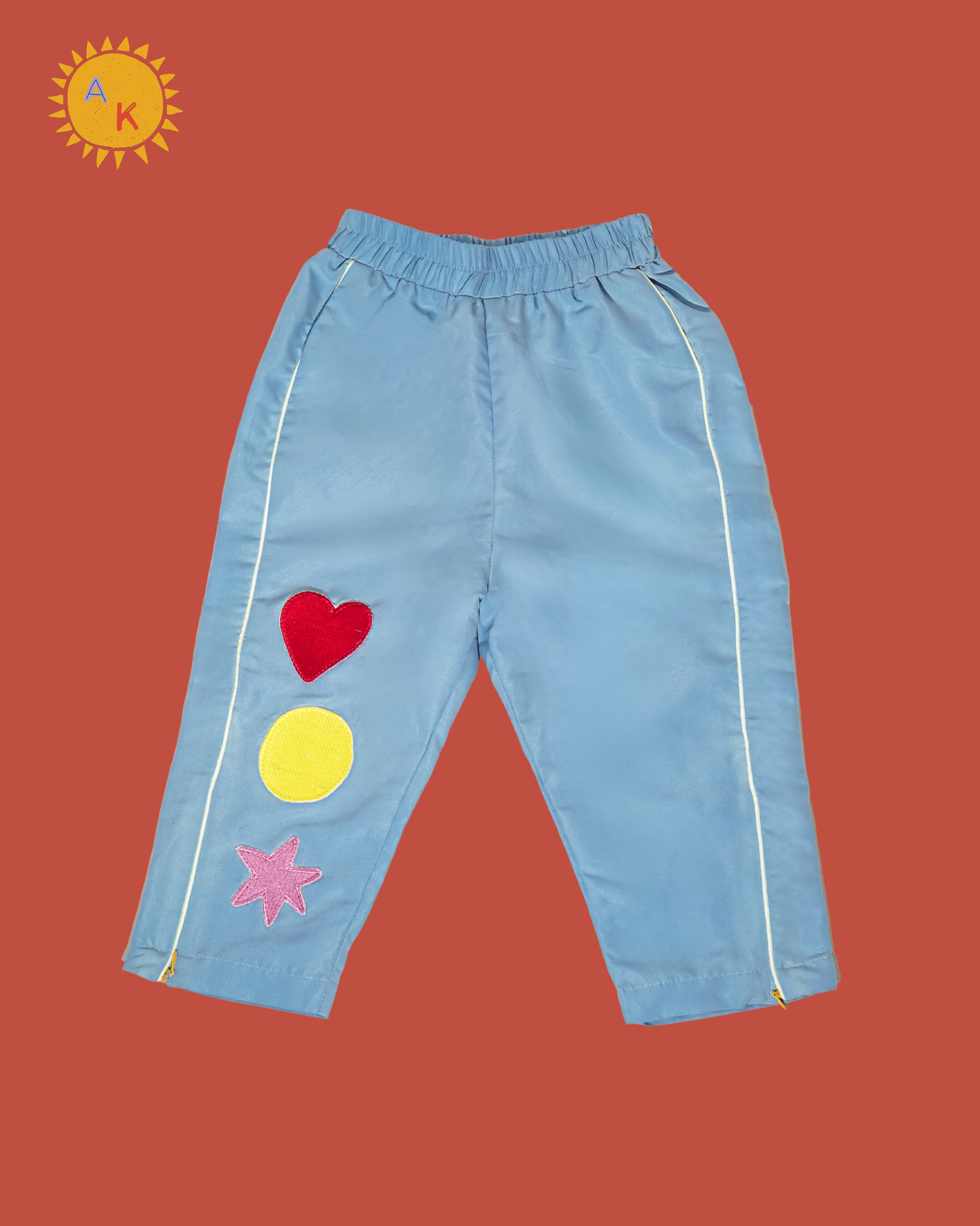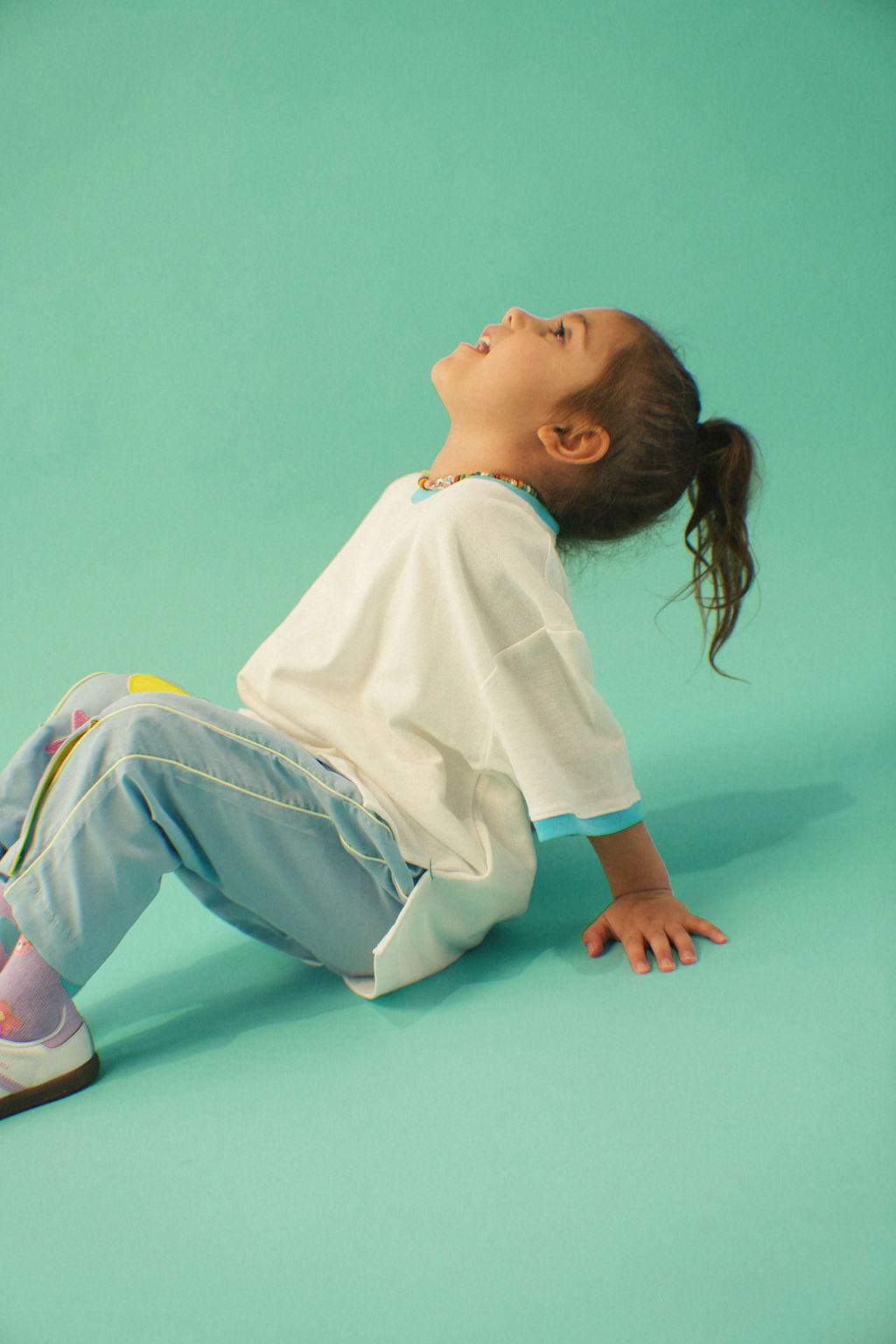 This eye-catching colour combo brings a playful twist to your streetwear vibe. Featuring a bright blue sky shade, fun artwork patches by Michelle Jackson from La Terre Press , and soft yellow side stripes, these pants let you zip the hem for a choice between wide or straight-leg looks.