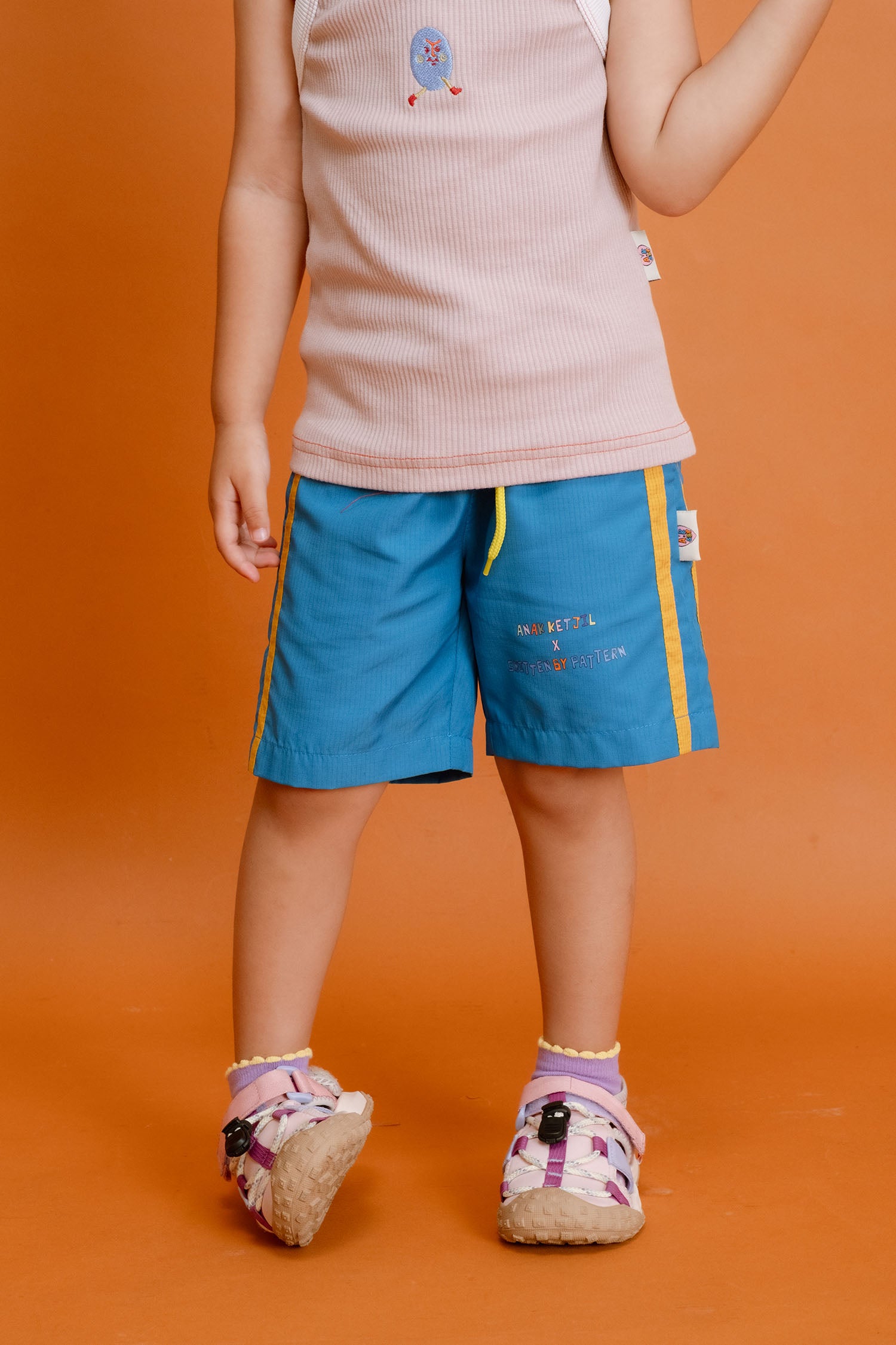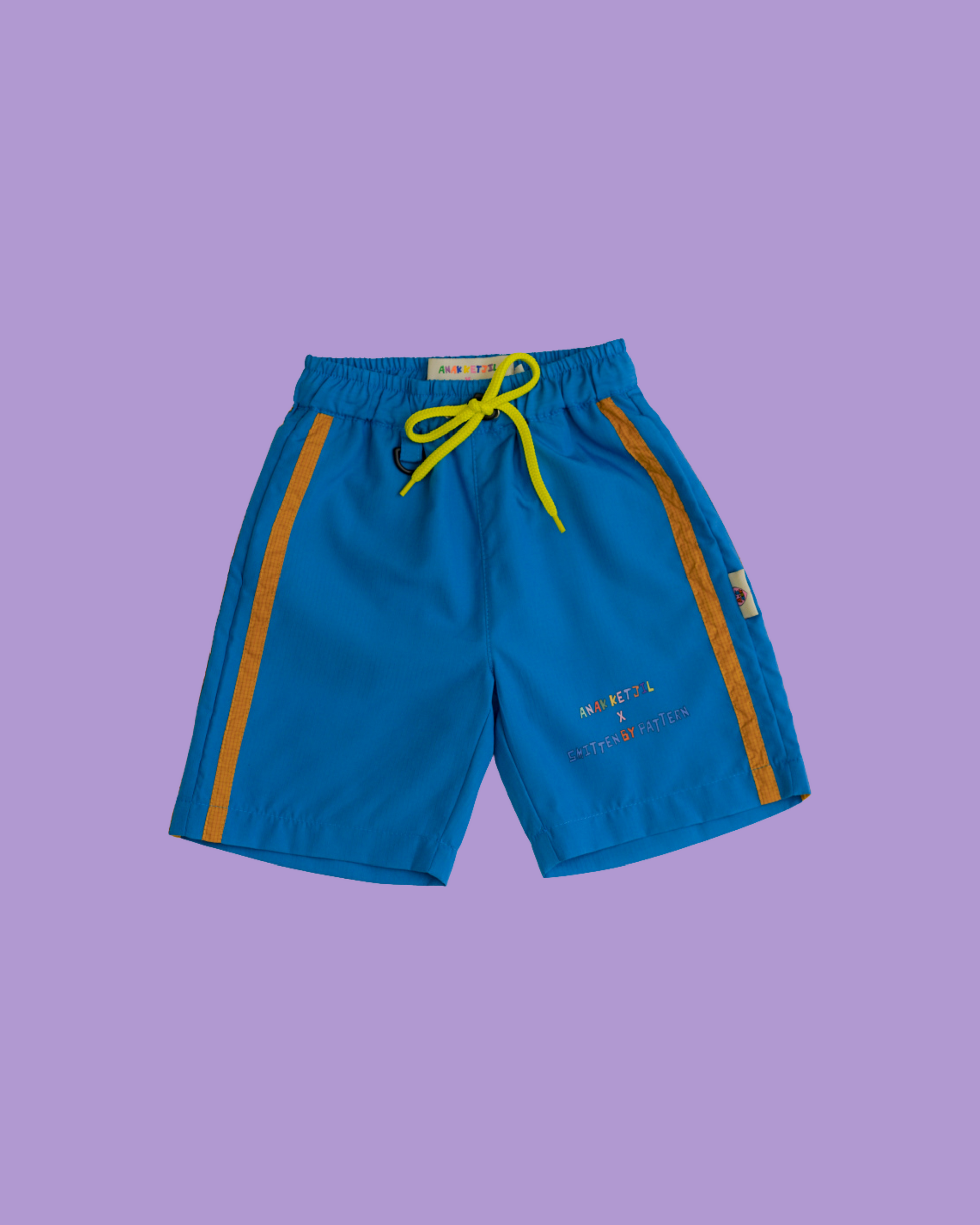 The Play Short is your minis go-to buddy for non-stop fun. Built tough from recycled nylon, it's ready for anything—splash in the pool, dash around the playground, or chill at home. The vibrant blue with cheeky yellow side stripes and matching drawstrings brings instant energy, while the playful graphic print and front logo detail make it unmistakably cool. Elastic waistband, D-ring loop, and comfy fit mean zero fuss, maximum play. Sporty, sustainable, and seriously fun.